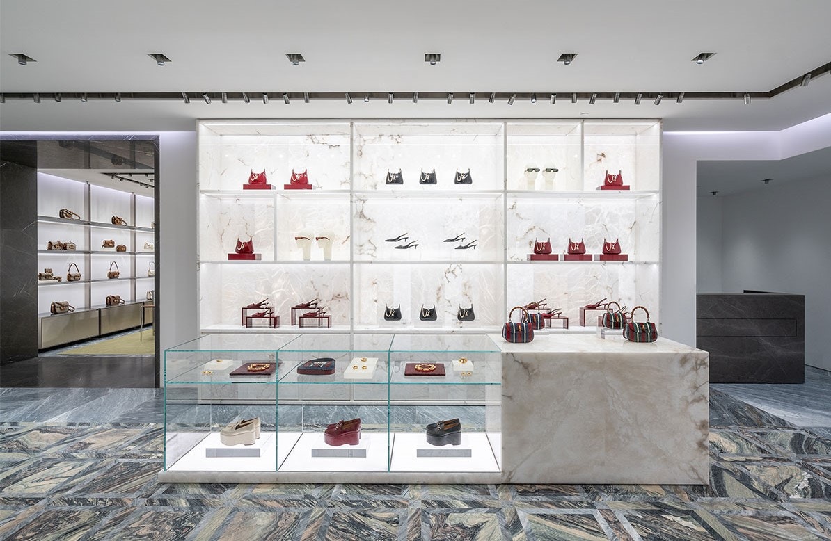 “The walk appears as a composition of cipollino and bardiglio marble, and a hypnotic and beautiful geometric pattern materializes on the floor. There is also a tribute to Italian tradition: Venetian glass has become a fundamental element in interiors, used for shelves and many other details.” (source: https://www.elledecor.com/it/viaggi/a46142224/boutique-gucci-via-monte-napoleone-milano)