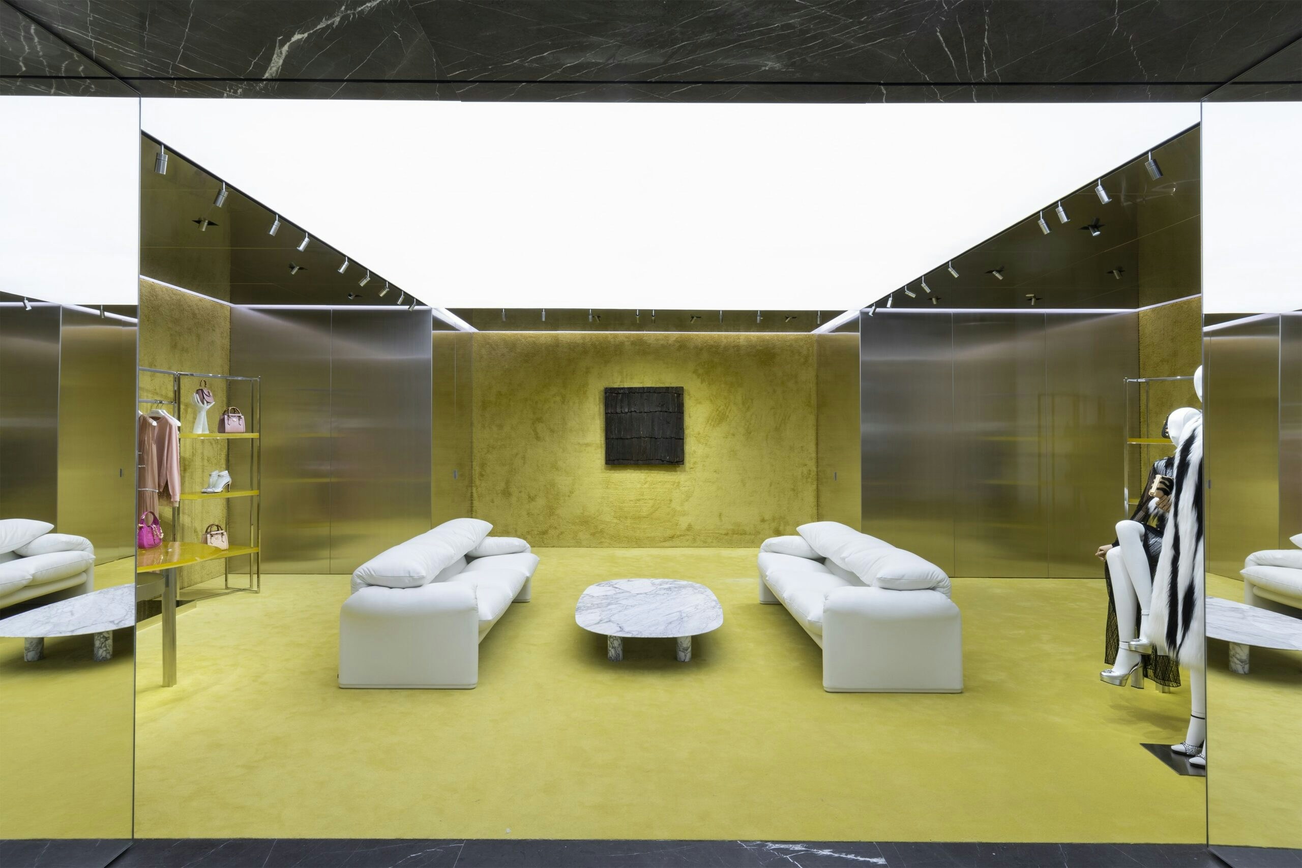 Inside this totally renovated space, visitors can completely immerse themselves in lines of Made in Italy craftsmanship mixed with exclusive materials, geometric patterns and works of art. The collection itself takes over the shop and envelops everything, even covering the walls.